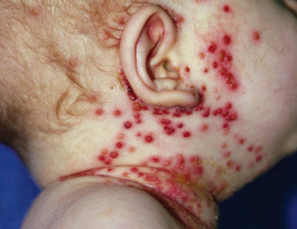 Diffusion d'une infection herpétique chez un enfant ayant une dermatite atopique.