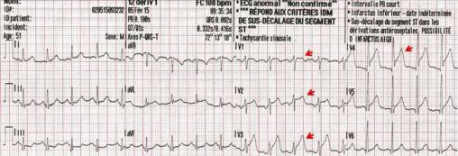 Les flèches rouges indiquent la présence d'un sus-décalage du segment ST.