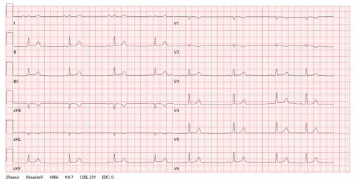 Marie-Lou Dessus, La Revue du Praticien Fréquence cardiaque de 49 battements par minute, rythme régulier sinusal, pas de trouble de la dépolarisation, pas de trouble de la conduction. QT corrigé à 405,4 ms.