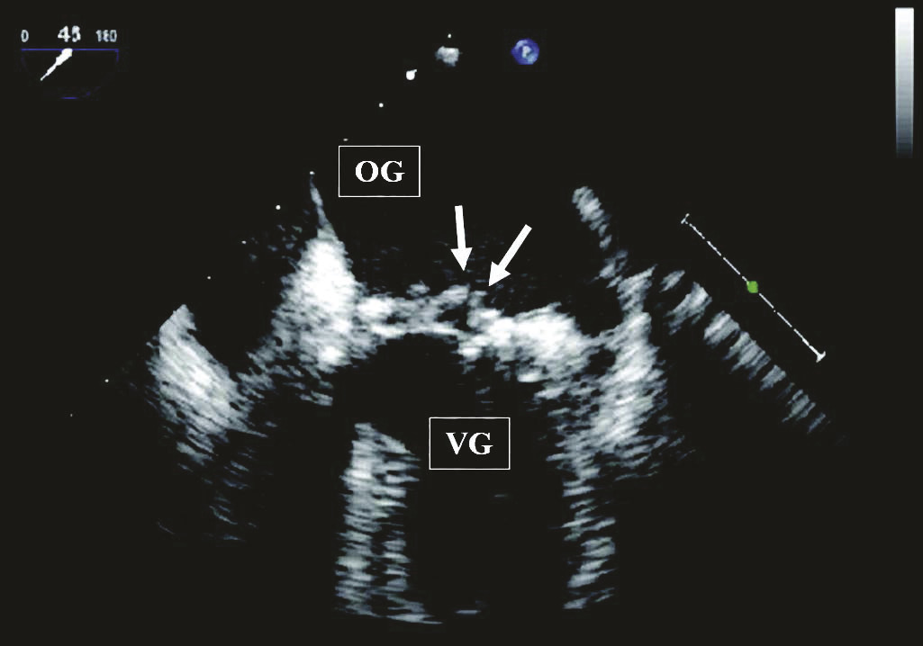 Image échocardiographique par voie transœsophagienne : aspect de végétations (flèches) sur le versant auriculaire de la valve mitrale située entre l’oreillette gauche et le ventricule gauche.