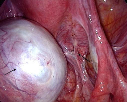 Endométriose profonde du ligament utéro-sacré droit (flèche continue) et kyste ovarien endométriosique gauche (flèche discontinue), vue cœlioscopique. Voir : Daraï É, Bazot M, Ballester M, Belghiti J. Endométriose. Rev Prat 2014;64:545-50.