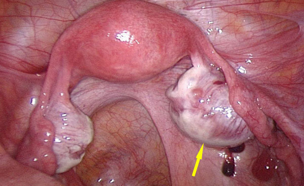 © Émile Daraï, Marc Bazot, Marcos Ballester (La Revue du Praticien) Endométriose kystique ovarienne ou endométriome (vue cœlioscopique). Tiré de : Darai É, Bazot M, Ballester M. Endométriose. Rev Prat 2010;60:603-9.