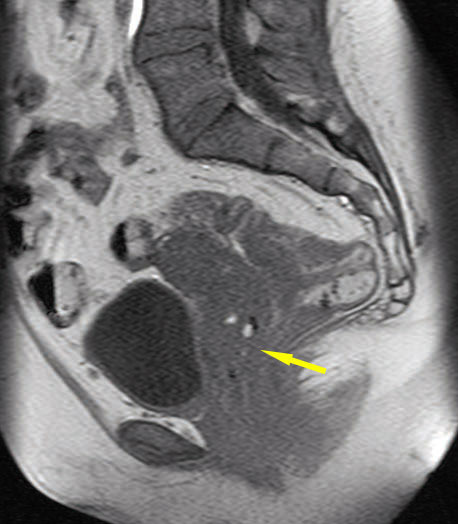 Imagerie par résonance magnétique, en coupe sagittale, en pondération T1, montrant des spots hyperintenses focalisés témoignant d’implants hémorragiques localisés dans le cul-de-sac vaginal postérieur.
