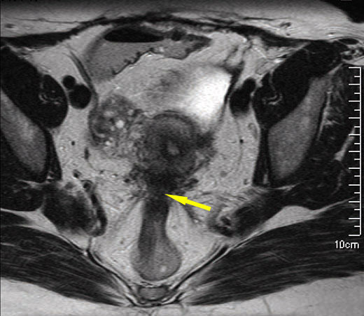 Imagerie par résonance magnétique,en coupe axiale, en pondération T2 passant par le col utérin montrant un épaississement arciforme irrégulier hypo-intense rétrocervical typique d’atteinte endométriosique du torus uterinus et des deux ligaments utéro-sacrés avec atteinte postérieure par contiguïté de la face antérieure du rectosigmoïde. Tiré de : Darai É, Bazot M, Ballester M. Endométriose. Rev Prat 2010;60:603-9.