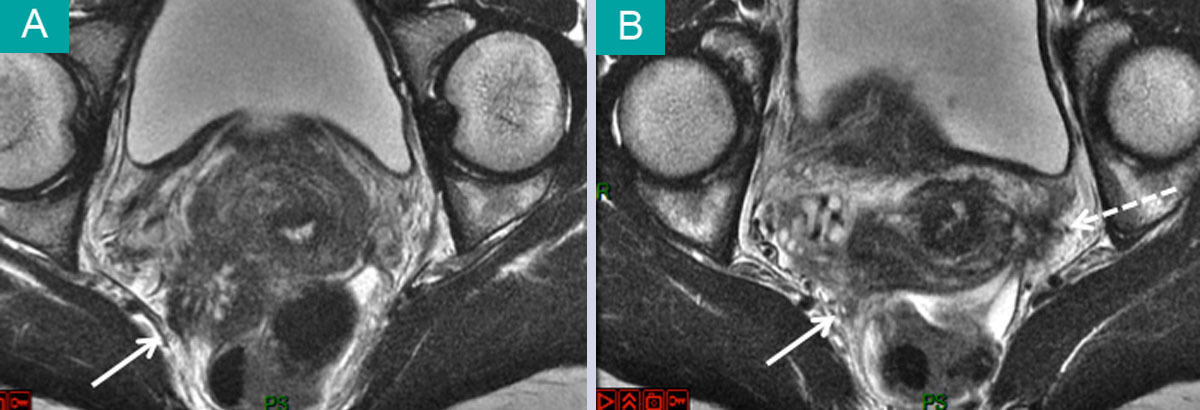 Imagerie par résonance magnétique en coupe oblique, en séquence pondérée T2. (A) Section du pelvis au niveau de l'isthme utérin. Nodule d'endométriose profonde infiltrant la fosse pararectale (flèche continue). (B) Section du pelvis au niveau paracervical. Endométriose profonde infiltrant la fosse pararectale (flèche continue). Endométriose profonde infiltrant le paramètre (flèche discontinue). Voir : Daraï É, Bazot M, Ballester M, Belghiti J. Endométriose. Rev Prat 2014;64:545-50.