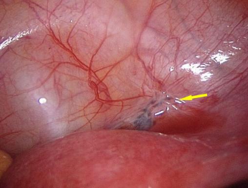 © Émile Daraï, Marc Bazot, Marcos Ballester (La Revue du Praticien) Endométriose superficielle du péritoine prévésical (vue cœlioscopique). Tiré de : Darai É, Bazot M, Ballester M. Endométriose. Rev Prat 2010;60:603-9.