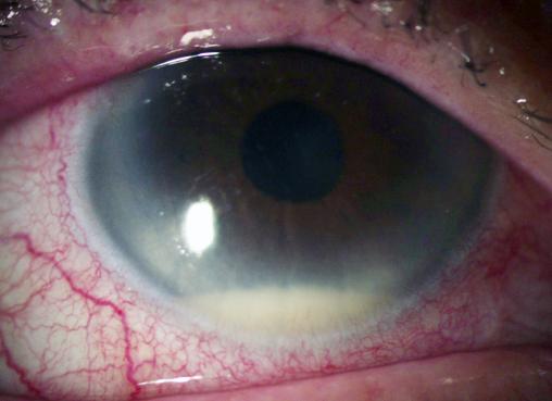 Infection postopératoire, survenue 5 jours après une chirurgie de la cataracte. On note l’hypopion.