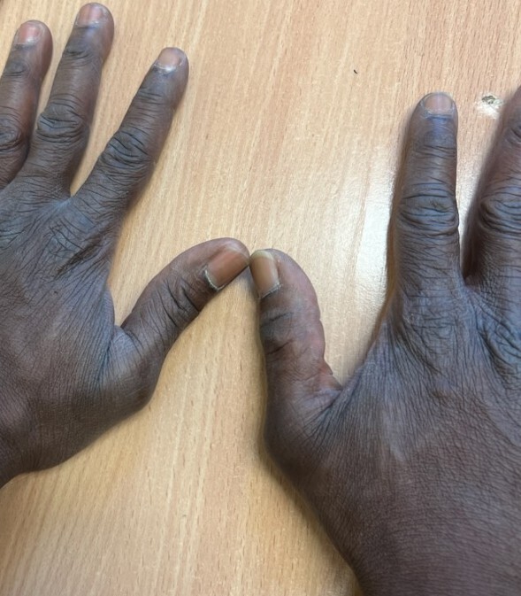 Entorse du pouce droit : l'articulation est œdématiée avec déviation axiale. Extrait de : Entorse grave du pouce