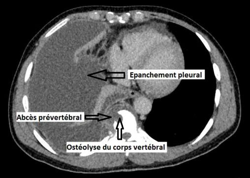 Épanchement pleural droit, ostéolyse vertébrale, abcès prévertébral