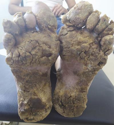 Lésions hyperkératosiques jaunâtres et brunâtres au niveau des plantes de pieds. Extrait de : Épidermodysplasie verruciforme ou homme-arbre
