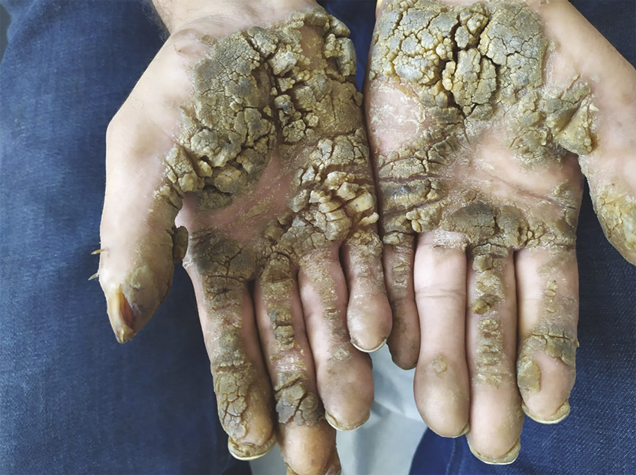 Lésions verruqueuses hyperkératosiques jaunâtres et brunâtres au niveau des paumes des mains. Extrait de : Épidermodysplasie verruciforme ou homme-arbre