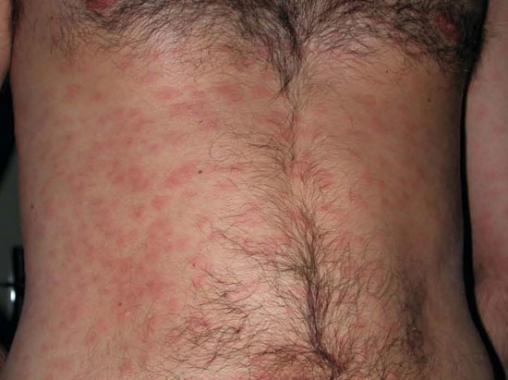 Eléments rosés exclusivement sur le tronc, la plupart maculeux. Il s’agit d’une roséole syphilitique correspondant à la phase précoce de la syphilis secondaire. Les 2 tests sérologiques (VDRL et TPHA) sont positifs. Le bilan n’a pas montré de complications liées à la syphilis (en particulier l’examen ophtalmologique était normal). Le traitement repose sur une injection d’Extencilline de 2,4 millions d’unités. Ce type d’éruption est souvent prise à tort pour une toxidermie ou une virose, car elle est le plus souvent fugace. Il faut donc évoquer le diagnostic de syphilis devant tout « rash » cutané (coll. N. Dupin).