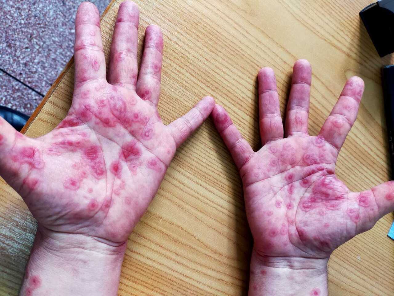 Lésions maculo-papuleuses (parfois de vésicules ou de bulles) ayant un aspect typique en cible ou en cocarde (lésion papuleuse annulaire à trois anneaux concentriques). L’éruption touche les extrémités (souvent les paumes et les plantes), de façon symétrique, le visage ou, plus rarement, la muqueuse orale.
