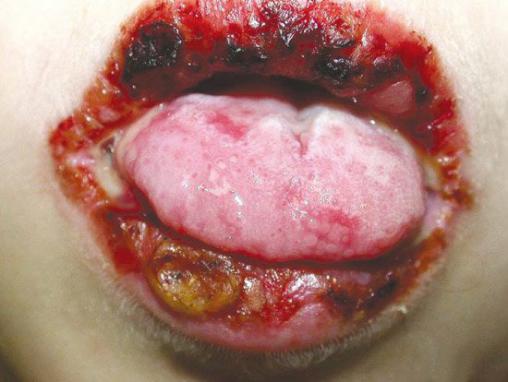 © Saskia Ingen-Housz-Oro (La Revue du Praticien) Atteinte de la muqueuse buccale et des lèvres. Contrairement à l’herpès orofacial, l’herpès génital ne donne pas d’érythème polymorphe.
