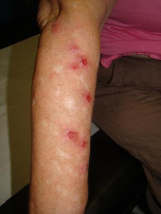 Dues à un grattage répétitif, ces manifestations ne sont pas exceptionnelles, surtout chez les femmes, même très jeunes. Les zones le plus souvent atteintes sont celles accessibles au contact : avant-bras, bras, jambes, cuisses, tronc (partie haute), visage. Les lésions peuvent avoir un caractère polymorphe. Les ulcérations sont souvent circulaires, parfois profondes, avec une bordure hypertrophique, ou croûteuses. Des papules d’acné excoriées, des ulcérations linéaires ou des lésions de pseudo-folliculite sont également décrites.