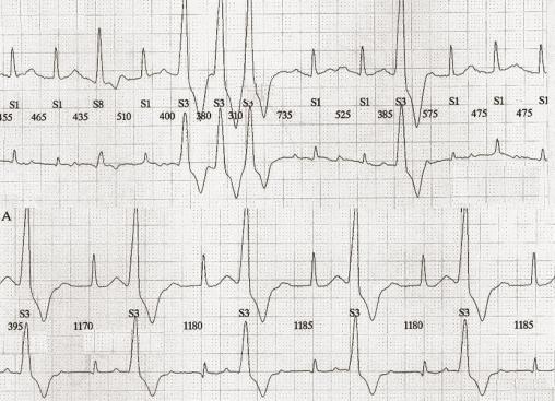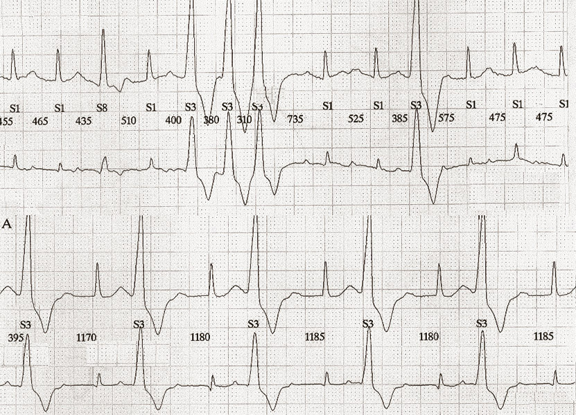 ©La Revue du Praticien Sur un enregistrement "Holter", extrasystole ventriculaire bénigne avec un triplet et un bigéminisme.