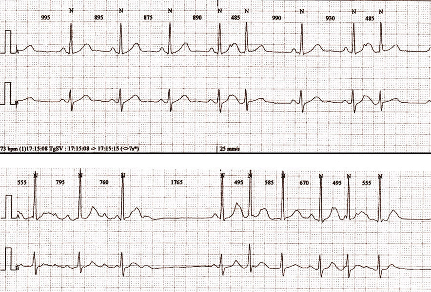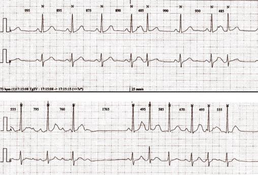 ©La Revue du Praticien Extrasystoles atriales . Sur un enregistrement "Holter", extrasystole atriale conduite au ventricule avec un QRS fin, extrasystole bloquée, mise en route d'une fibrillation auriculaire paroxystique.