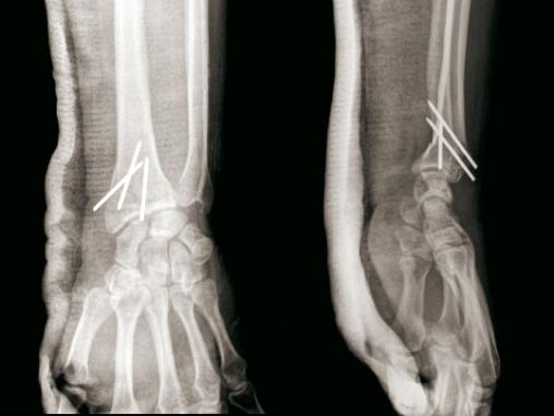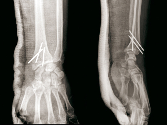 © Henry Coudane, Frédéric Éloy (La Revue du Praticien) Embrochage intrafocal selon Kapandji avec trois broches. (À gauche) Radio de face. (À droite) Radio de profil.