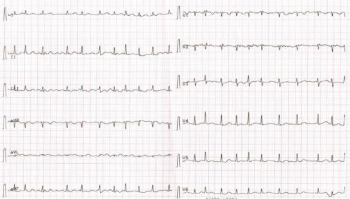 Institut Gustave-Roussy, La Revue du Praticien Électrocardiogramme : on retrouve une tachycardie non sinusale (absence d’onde P) irrégulière, à QRS fin, ce qui signe une fibrillation atriale.
