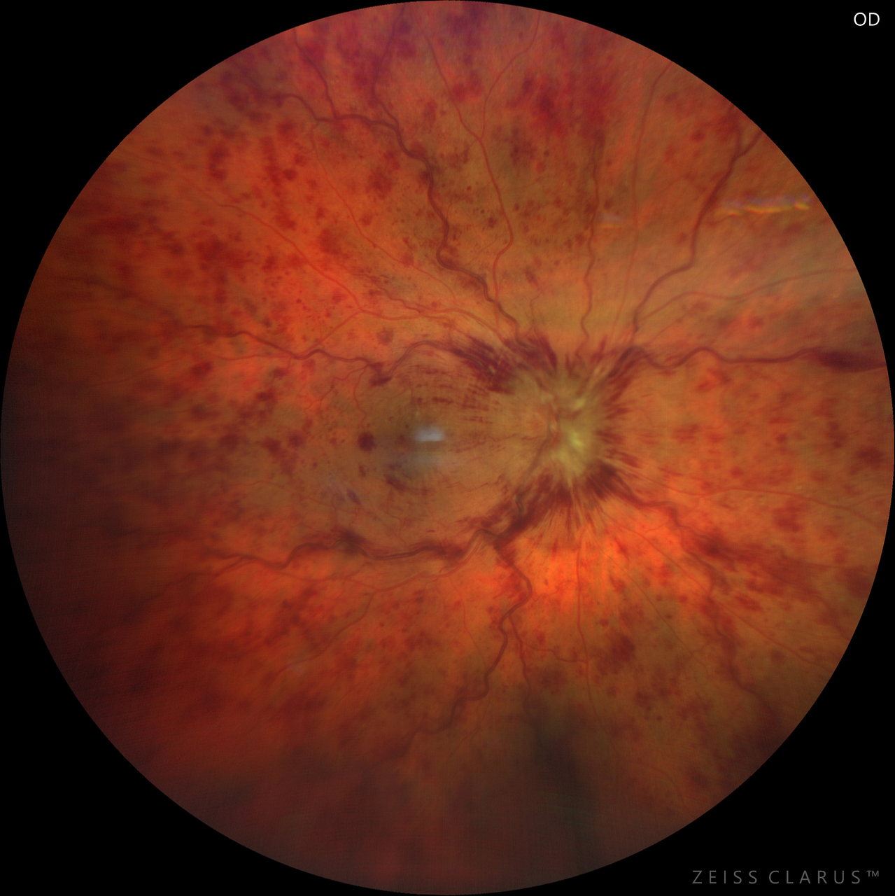 Photographie du fond de l’œil droit d’une patiente présentant une occlusion de la veine centrale de la rétine.