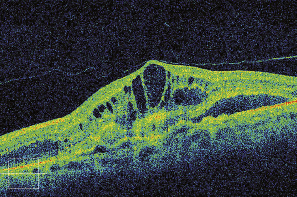 © Jean-François Korobelnik, La Revue du Praticien Tomographie en cohérence optique : vaste lésion avec épaississement rétinien, œdème intrarétinien, et décollement rétinien localisé.
