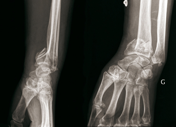 © Henry Coudane, Frédéric Éloy (La Revue du Praticien) Fracture extra-articulaire à déplacement antérieur. (À gauche) Radio de profil. (À droite) Radio de face.