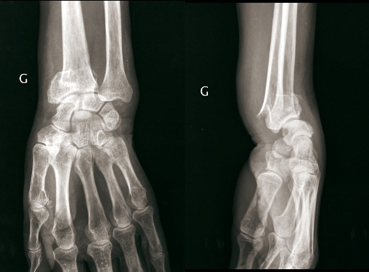 © Henry Coudane, Frédéric Éloy (La Revue du Praticien) Fracture extra-articulaire à déplacement postérieur. (À gauche) Radio de face. (À droite) Radio de profil.