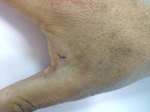 Coll. Dr Antoine BERTOLOTTI, La Revue du Praticien. Vésicule perlée à fond érythémateux et sillon de grattage en interdigital.