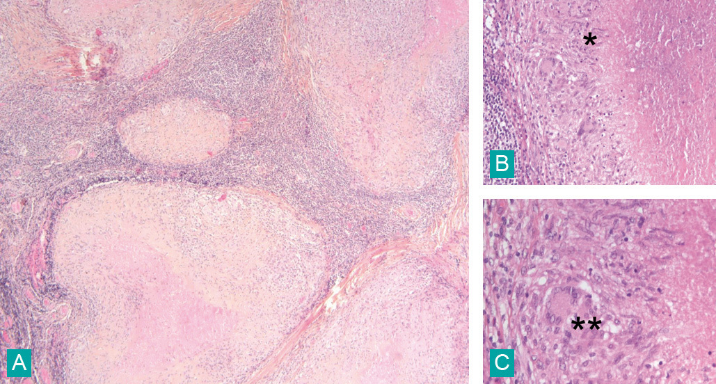 © Julie Bruneau, Nicole Brousse (La Revue du Praticien) Présence de nodules granulomateux tuberculoïdes, avec nécrose centrale (A) et couronne palissadique épithélioïde et gigantocellulaire (B,*) : cellules géantes multinucléées de Langhans (C,**).