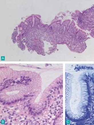 Biopsie gastrique : infiltrat inflammatoire du chorion, avec présence de polynucléaires dans l'épithélium (A, B). La coloration de Giemsa (C) modifié met en évidence de nombreux Helicobacter pylori dans la lumière des glandes et le revêtement épithélial.