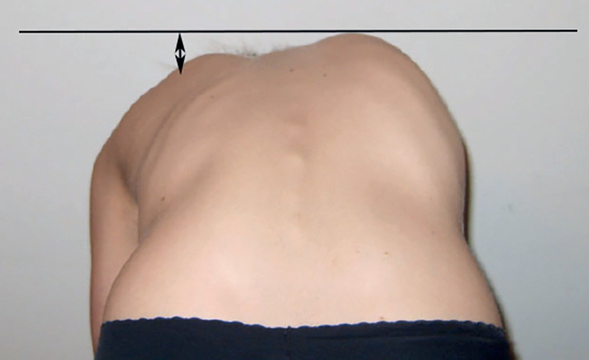 Gibbosité thoracique droite, signant le caractère structural de la scoliose. Extrait de : Scoliose : quand s’inquiéter ? Extrait de : Scoliose : les repères pour le MG