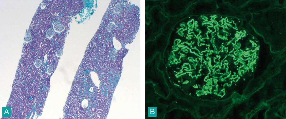 © Julie Bruneau, Nicole Brousse (La Revue du Praticien) A. Trichrome vert de Masson : parenchyme rénal cortical.B. Immunofluorescence anti-IgG : dépôts granuleux extra-membraneux.