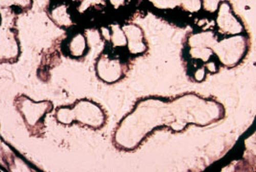 La Revue du Praticien - Christian Jacquot La membrane basale s’insinue entre les dépôts extramembraneux (non colorés par l’argent) en formant des spicule.