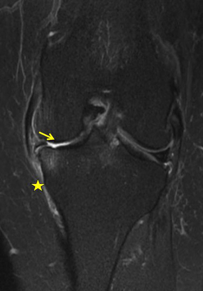 IRM du genou gauche pour une gonalgie gauche interne. Lésions dégénérative et luxation latérale du segment moyen du ménisque interne gauche avec disparition complète du cartilage tibial et condylien interne (flèche jaune. À noter, une ténosynovite des tendons de la patte d’oie (astérisque jaune).