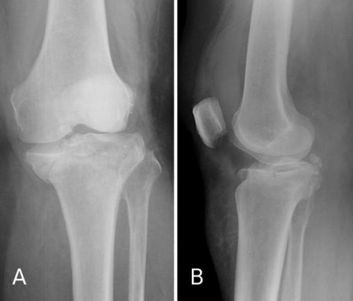 Face (A) et profil (B) d'une patiente victime d'un traumatisme responsable d'une fracture articulaire complexe du tibia proximal. Cette fracture combinant un enfoncement et une séparation des deux plateaux tibiaux entraine des dommages cartilagineux qui exposent, à terme, et même après restauration anatomique de la surface articulaire à une gonarthrose post-traumatique.