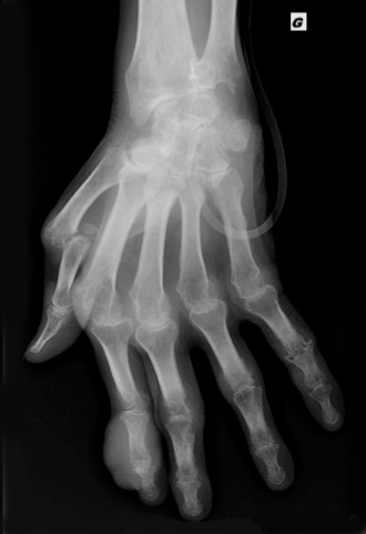 Radiographie de main/poignet gauches de face. Goutte chronique tophacée. Association de lésion destructrices (géodes et érosions) et constructrices : styloïde ulnaire, métacarpophalangiennes (1re et 2e), interphalangiennes proximales (3e, 4e et 5e), interphalangiennes distales (2e et 5e). Pincement des interlignes radio-carpien, radio-ulnaire inférieur, intra-carpiens et des métacarpo- phalangiennes (2e, 3e, 4e, 5e). Luxation de la 1re métacarpophalangienne. Volumineux tophus en regard des interphalangiennes proximale et distale du 2e doigt.