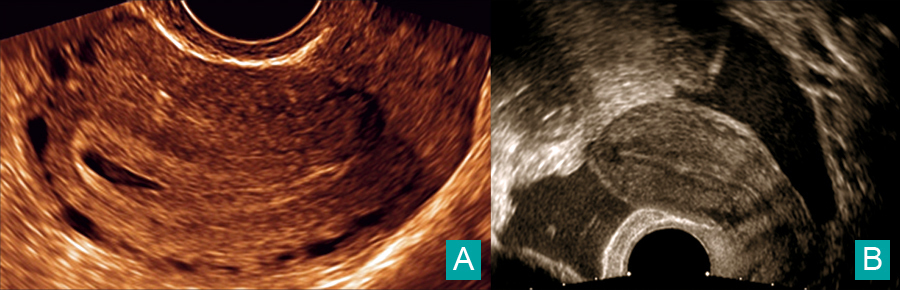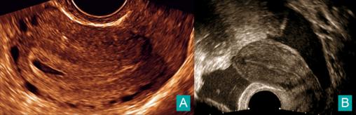 Charlotte Laplane, Claude d’Ercole (La Revue du Praticien) A. Pseudo-sac gestationnel.B. Épanchement du cul-de-sac de Douglas.