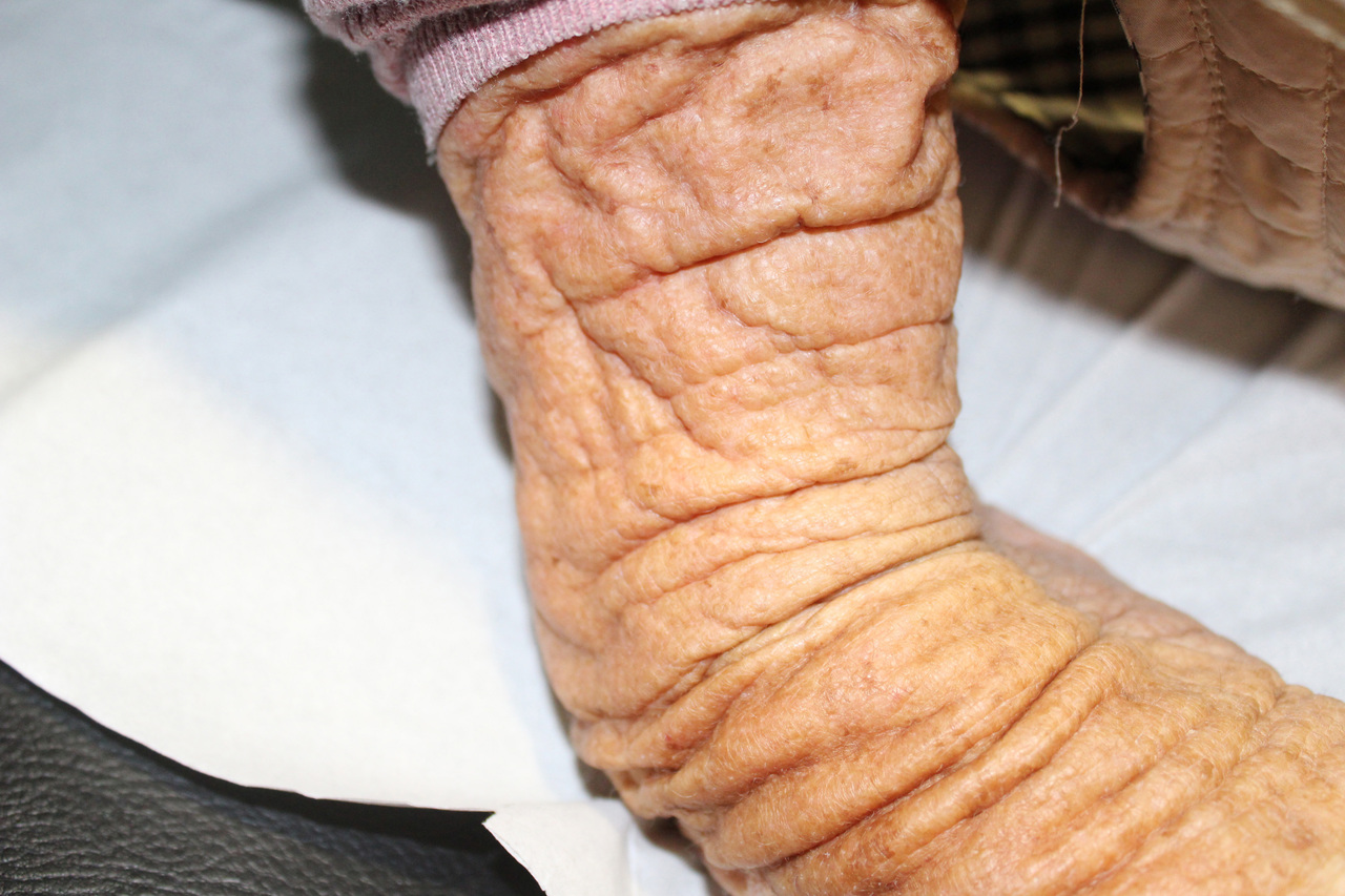 Bras et avant-bras avec peau est très épaissie et profondément ridée