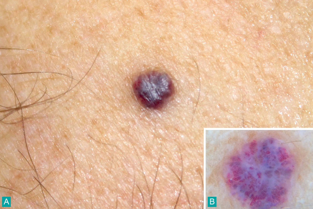 Cette lésion a un centre bleu très foncé et est violette en périphérie, il s’agit d’un hémangiome capillaire, fréquent chez les sujets jeunes. Lésion nodulaire se développant dans le tissu sous-cutané, elle n’est pas pulsatile (absence de communication artérioveineuse). De nombreuses boucles capillaires lui donnent parfois un aspect de framboise caractéristique. Lorsqu’elle se thrombose, elle peut devenir plus sombre