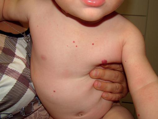 Angiomes cutanés, dispersés sur tout le corps et de plus en plus nombreux depuis sa naissance. Il s'agit d'un Hémangiome multifocal infantile. C'est une entité rare qui se caractérise par un développement capillaire, en efflorescence, de petites lésions (quelques millimètres de diamètre), dès les premières semaines de vie et au-delà de 1 an. Touchant la totalité du corps, elle doit faire rechercher une localisation viscérale, rare toutefois : poumons, trachée, cerveau, oeil, coeur, et surtout foie. Le pronostic vital peut être engagé s’il y a retentissement hémodynamique : lésions hépatiques volumineuses provoquant (par hyperdébit hépatique) une insuffisance cardiaque à haut débit.