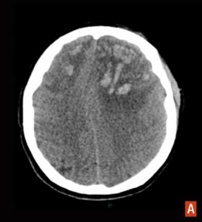 Hématome lobaire frontal bilatéral, secondaire à une thrombose veineuse du sinus sagittal supérieur. Hyperdensité spontanée associée à un oedème avec effet de masse, TDM cérébrale sans injection.