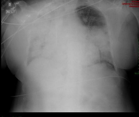 Étienne Crickx, La Revue du Praticien Radiographie thoracique F. Opacités alvéolaire périhilaires bilatérales prédominant à droite (hémorragie intra-alvéolaire).