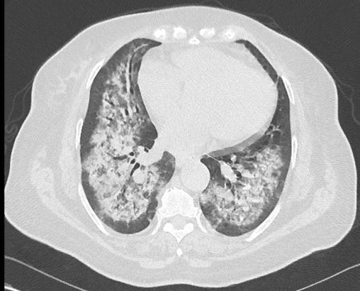 Étienne Crickx, La Revue du Praticien Scanner thoracique, coupe parenchymateuse. Opacités alvéolaires périhiliares, respectant les espaces sous pleuraux, bilatérales (hémorragie intra-alvéolaire).