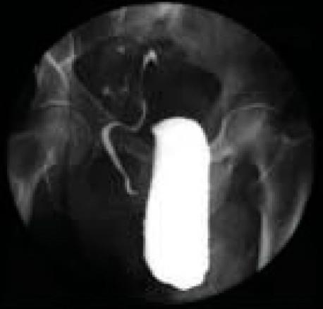Cystographie. Volumineuse hernie contenant la vessie chez un patient transplanté hépatique et rénal (Photo : centre de chirurgie viscérale et de transplantation [Pr Ph. Wolf], CHU Hautepierre, Strasbourg). Voir : Rohr S, Steinmetz JP, Brigand C, Meyer C. Diagnostic et complications des hernies de l'aine. Rev Prat 2003;53(15):1645-50.