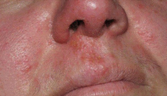 © Jean-Noël Dauendorffer, Philippe Saiag (La Revue du Praticien) Récurrence d’herpès labial. Situé à la jonction du versant cutané des lèvres et de la demi-muqueuse.