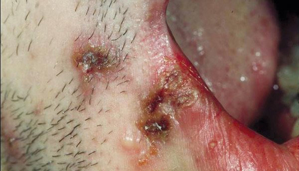 © Saskia Ingen-Housz-Oro (La Revue du Praticien) Récurrence d’herpès labial. Noter l’évolution croûteuse des vésicules.