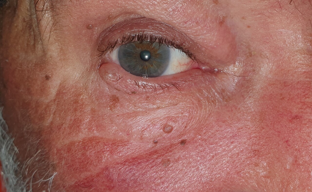 Formation nodulaire translucide au niveau de la paupière inférieure droite. Cette tumeur bénigne secondaire due à l’obstruction des canaux des glandes sudoripares, ici de la glande apocrine.