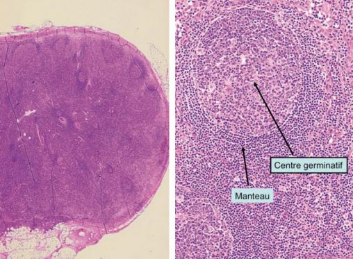 (À gauche) Faible grossissement. (B) Fort grossissement : follicule lymphoïde avec centre germinatif et zone du manteau entourant le centre germinatif. Voir : Molina TJ. Classification des lymphomes. Rev Prat 2010;60:48-52.