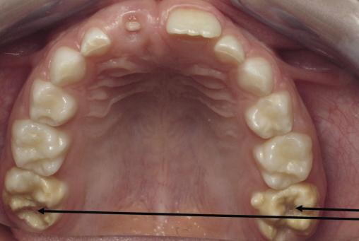 Atteintes MIH sur les premières molaires permanentes maxillaires (dents n° 16 et 26). Noter l’asymétrie des lésions et les pertes de substances.