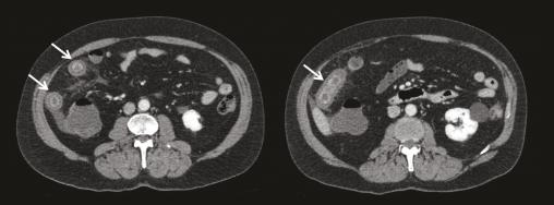 Iléite préterminale étendue se traduisant par un épaississement pariétal circonférentiel prenant le contraste (flèches). Extrait de : Vascularite à IgA de l’adulte